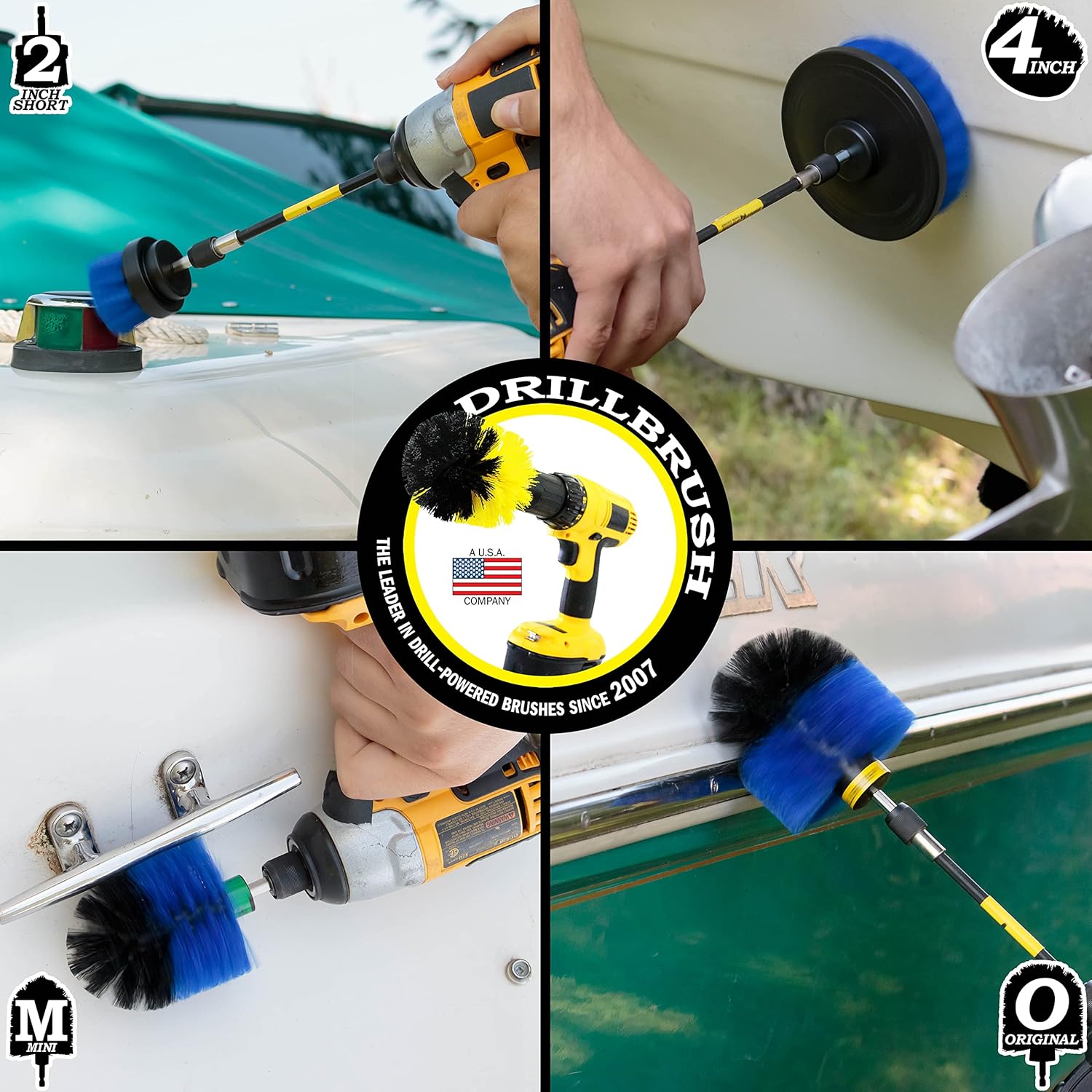 Included in this bundle are the 2inch flat brush, 4inch flat brush, original, mini original, and 5inch extension all in medium stiffness blue. Clean your marine vessels and pools like never before with these drill powered cleaning brushes.