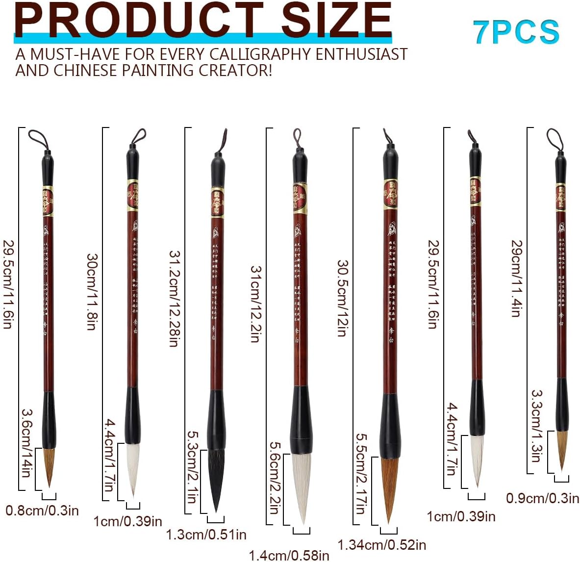 Description The brushes write smoothly and can render delicate strokes and beautiful character shapes. The lanyard design ensures that the brushes stay upright while drying, preventing damage or deformation of the bristles. Features 1.The bristles are soft and flexible, easy to absorb ink and write smoothly. 2.The brush shaft is made of high quality wood, lightweight, comfortable to hold and not easy to deform. 3.Each writing brush comes with a lanyard at the end for easy hanging and storage. 4.For calligraphy practice, writing Chinese New Year couplets, writing, sketching, ink painting, watercolour painting and other artistic creations. 5.Beautiful present box packaging, both practical, suitable as birthday, holiday presents for friends and relatives or calligraphy lovers. Specification Material:Cowhair,weasel hair,goat hair. Color:Wood. Size:As shown. Package 7 x BrushCleaning Method 1.Put the brush into the water to moisten and then gently turn it to let the ink inside disperse. 2. After washing, smooth the bristles and hang the brush up to dry. 3. Do not immerse the brush in water. 4. Please do not insert the brush into the barrel upside down before it dries.