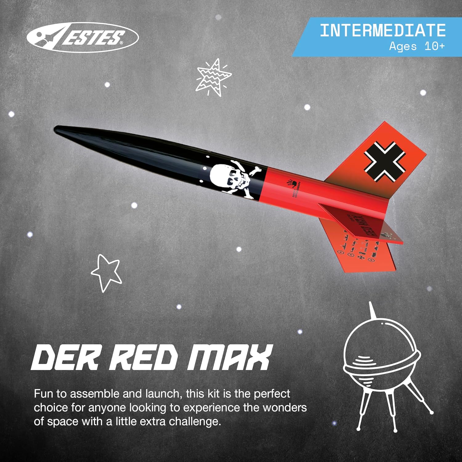 Product Description The Estes Der Red Max model-rocket-building kit encourages intermediate-level model rocket enthusiasts to fly high! Designed for adults and kids ages 10+ (supervision recommended for ages under 12), this model is a classic that can soar to heights of 600 ft. while using a standard Estes rocket engine (sold separately). It’s built with a large, stable design, features laser-cut wood fins for improved performance, and has a cool waterslide decal set for extra flair as it flies. This kit includes the reusable parts for launch, including a nose cone, a body tube, a recovery parachute, and design components.This model-rocket-building kit can inspire a solo STEM enthusiast or provide a demonstration for a group of rocketeers. It offers hands-on experience in engineering and aerospace, making it perfect for hobbyists, schools, clubs, and more.To build and launch this rocket, you will need scissors, pencil, ruler, fine sandpaper, carpenter’s glue, hobby knife, masking tape, primer (white), paint (black and red), an Estes Porta-Pad II Launch Pad, an Electron Beam Launch Controller, compatible Estes model rocket engines, Starters, and Recovery Wadding (sold separately). Always follow the NAR (National Association of Rocketry) model-rocket safety code during operation.Estes rocket kits are built from the highest-quality components and designed around the unforgettable experience of pressing “launch.” Our hobby and STEM educational products range across all skill levels, interests, and power levels. Unleash the space dreamer and science enthusiast in you with an Estes model rocket! From the Manufacturer The Der Red Max is a classic Estes model rocket and another of our most requested bring back models and for good reason. Not only is this a uniquely decorated model, but this model performs as good as it looks. This is one of those model rockets that has a personality all its own. Standing just a tad over 16" (41 cm), it is still one of our rockets that is a must have in your rocket arsenal. From the long, ballistic shaped nose cone, to the stubby fins and the truly unique decoration, this rocket has attitude. Even though it has been out of the product line for a while, it hasn’t lost anything in terms of performance and can still top out over 700' (213 m) when flown on standard engines. Recovery is accomplished with a colorful 18" (46 cm) preassembled parachute for safe landings.