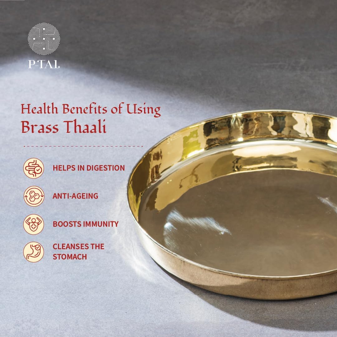 Food is a significant part of life. The food we eat is made with care & served with love. Add an element of royal grace to this by using this beautiful Brass thaali set especially curated for you by P-TAL. The katoris & glasses are tin-coated that adds a unique flavor to food and makes them completely safe and healthy to consume out of. Gift the set to someone you love or use it yourself for an experience beyond words. The contents of this beautiful thaali set are: 1 pc Brass thaali (11") 2 pcs Brass Katoris or bowls 1 pc Brass Glass 1 pc Brass Spoon