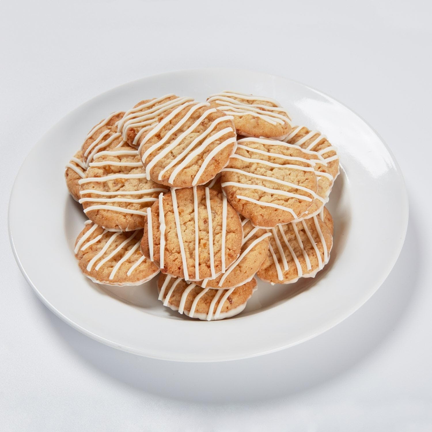 Indulge in the comforting flavor of our Peach Cobbler Crunchy Cookie Thins. A creation truly embodying the essence of a homemade peach cobbler baked to crunchy perfection and drizzled with velvety white icing. These bite-sized cookie thins are perfect for including as a treat in your lunch or as a snack. The real peach pieces, hints of cinnamon spice, and icing are sure to satisfy your sweet tooth.