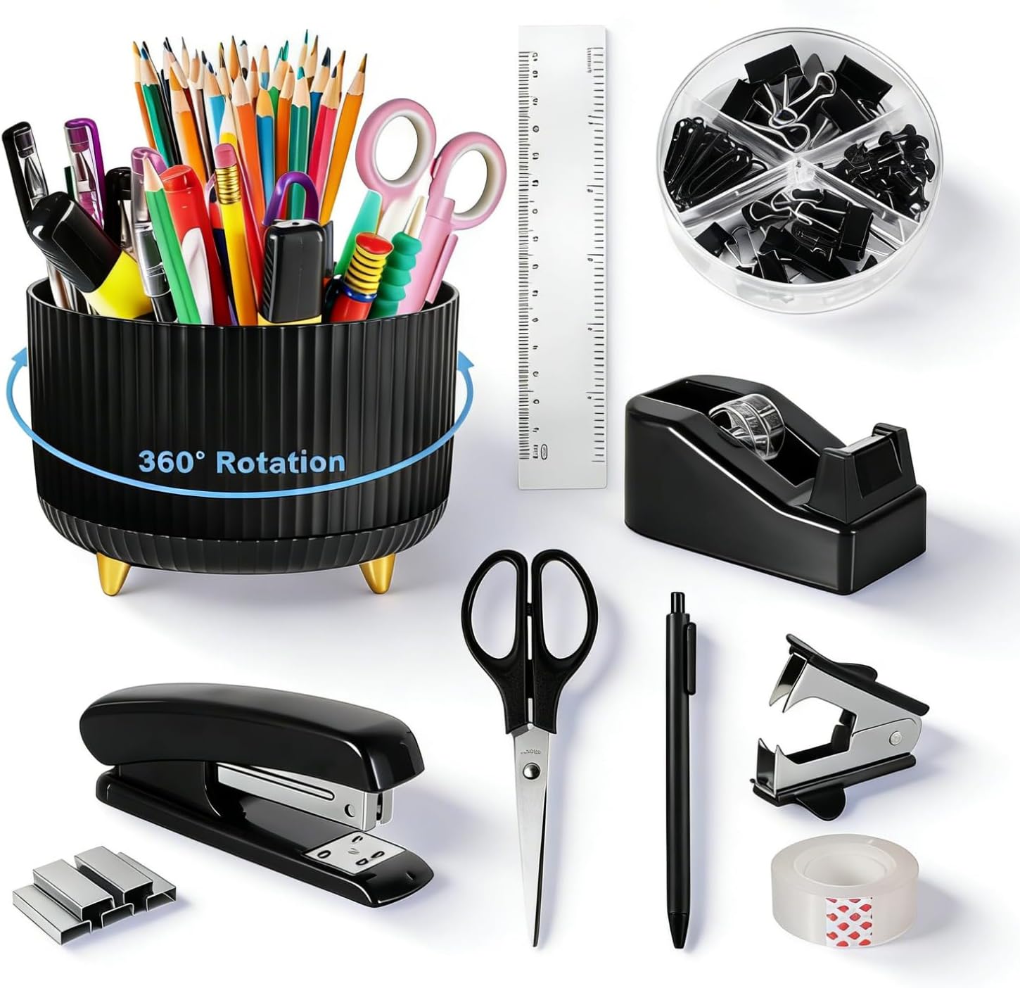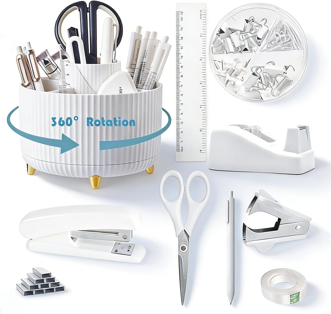 | Included Components | 1 x desk organizer, 1 x 360-degree rotating pen holder, 1 x tape holder, 1 x stapler, 1 x scissor, 1 x staple remover, 1 x box of binder clips, 1000 x staples, 1 x calculator, 1 x utility knife, 1 x notepad, 2 x ballpoint pen, 1 x index tab, 1 x Sticky note, 1 x PU leather storage bag, 1 x phone holder, 1 x tape, 1 x ruler |