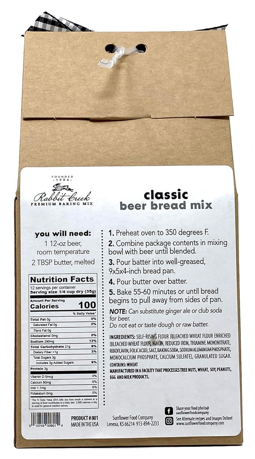 Beer Bread Mix – Rabbit Creek beer bread mixes are quick and easy to make, just add a 12 oz beer, mix and bake. Please note that you can substitute ginger ale or club soda for the beer. Each mix makes one loaf. Not recommend for use in a bread machine. Made in the USA