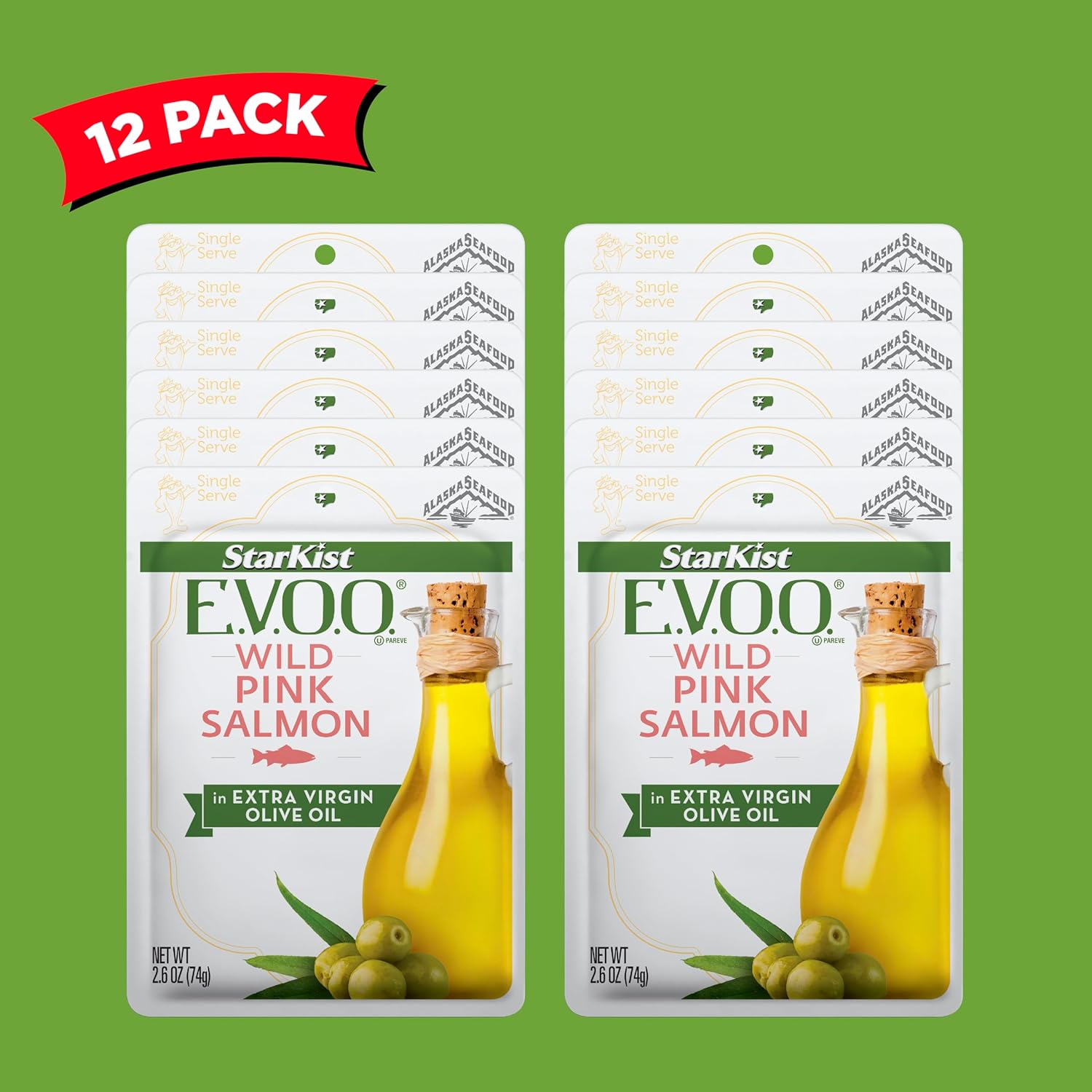 Whether you’re squeezing in lunch between meetings during a busy workday or want a quick, protein-packed snack between soccer practice, school and other daily errands, StarKist E.V.O.O. Wild-Caught Pink Salmon is the perfect choice! This 2.6 oz pouch features premium skinless, boneless, and 100% Wild Caught Pink Salmon packed in cold-pressed Extra Virgin Olive Oil for a savory taste ready for your next recipe! Packed in our no-drain, flavor fresh pouch, it’s easy to take this natural source of Omega-3s anywhere and eat anytime. Enjoy on a salad, in a sandwich, on crackers, or right from the pouch! Plus, it is dolphin safe, soy free, gluten free and works well with Keto, Paleo, DASH and Mediterranean diet plans! This ready to eat salmon is a natural source of protein. It has 14g of protein and 190 calories per pouch. Plus, these pouches are easy to store, so you can stock up with this 12-Pack, and keep salmon singles in your office, pantry at home and even in your diaper bag or car! An industry innovator, StarKist was the first brand to introduce StarKist single-serve pouch products, which include Tuna, Salmon and Chicken Creations, and StarKist Selects E.V.O.O. As America’s favorite tuna*, StarKist represents a tradition of quality, consumer trust and a commitment to sustainability. *Nielsen Custom Scantrak Data xAOC Dollar Share Latest 52 Weeks
