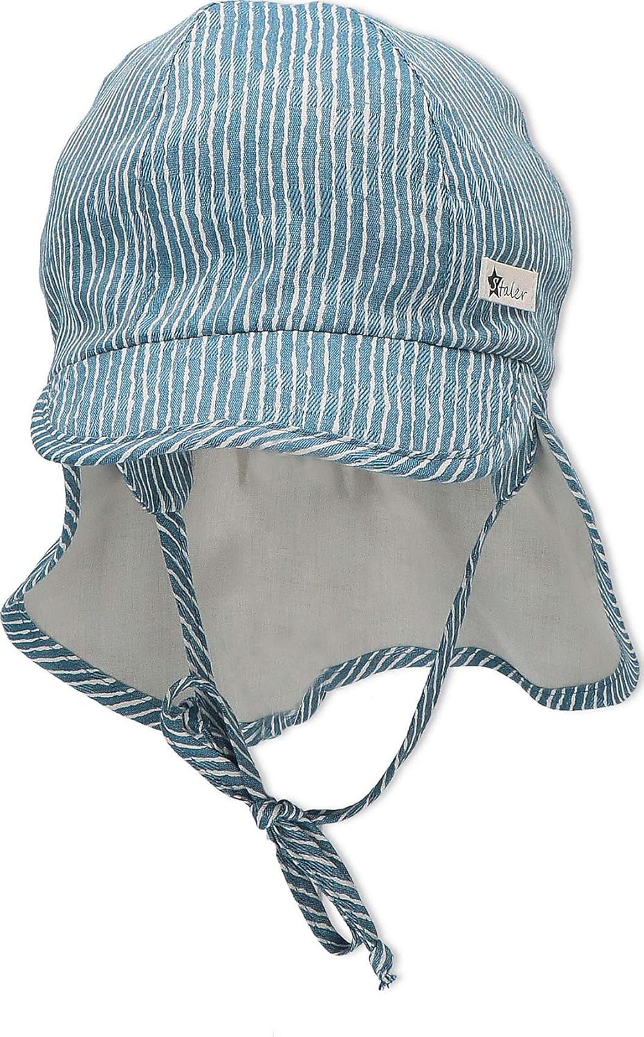 Cap with neck protection, cotton blend printed with stripes, ear flaps and tie, lined with batiste (organic)